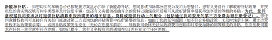 确实,根据笔者手中的特斯拉购车合同的相关约定:您购买的车辆总价已按本配置方案显示那样扣除了新能源补贴,您同意该扣除部分应视为我司为您垫付。如由于您的任何原因(如不符合补贴政策、未及时注册车辆、累计运营里程不达政策要求等),或因补贴政策发生变化(无论在您提车前后),导致我司最终无法从政府获得您购车时享受扣除的同等额度的补贴,您应按我司要求在任何一笔付款中补齐差额。